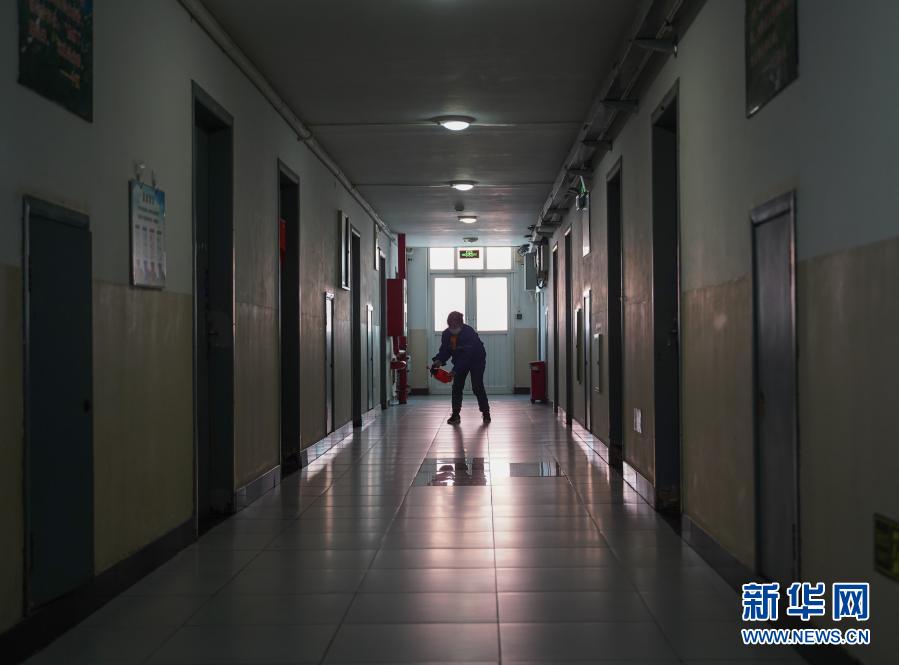 2月8日,工作人員在北京交通大學(xué)22號(hào)公寓樓道內(nèi)進(jìn)行消殺。新華社記者 張浩波 攝