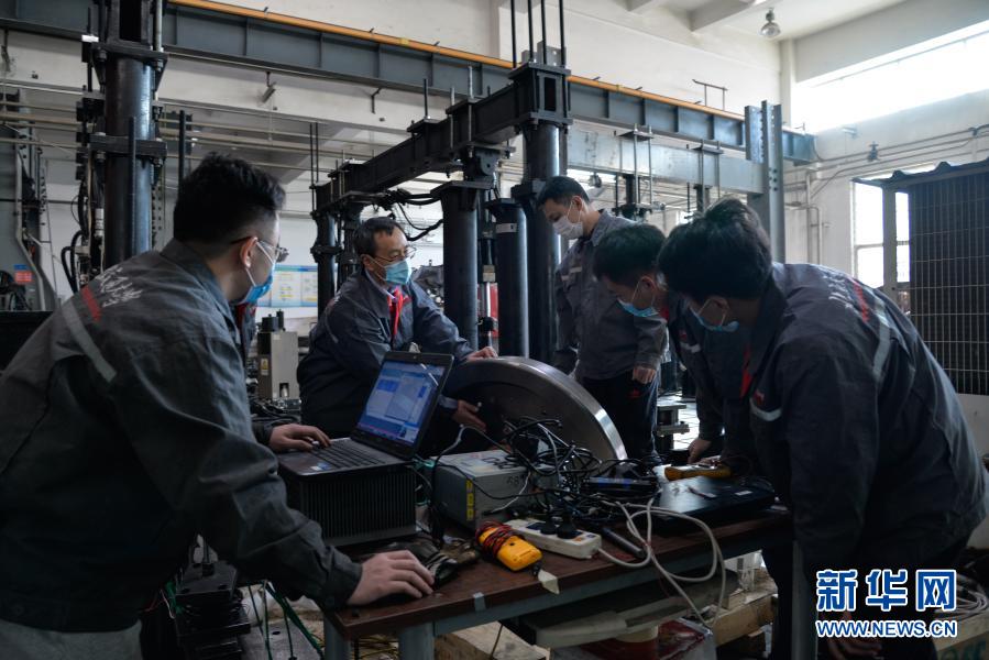 2月9日,北京交通大學(xué)教師和學(xué)生在結(jié)構(gòu)強(qiáng)度檢測(cè)實(shí)驗(yàn)室一起研討高速列車輪軸結(jié)構(gòu)可靠性。新華社記者 徐欽 攝
