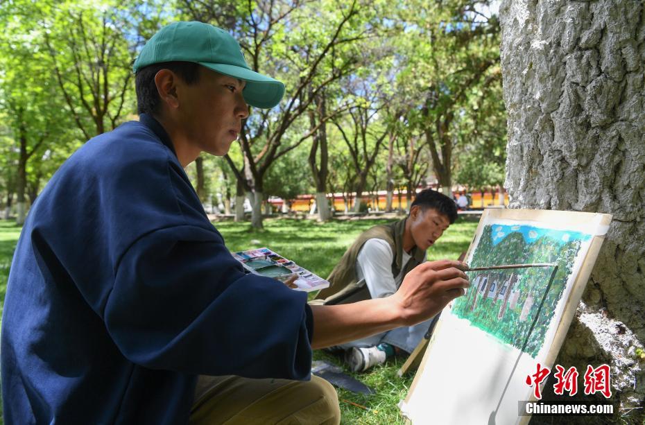 7月8日,西藏大學(xué)建筑系學(xué)生前往西藏自治區(qū)拉薩市城關(guān)區(qū)羅布林卡進(jìn)行建筑美術(shù)實習(xí)。在7天的實習(xí)中,學(xué)生們將在哲蚌寺、色拉寺等地,把西藏民族特色建筑、風(fēng)景一幅幅手繪在紙上。圖為西藏大學(xué)建筑系學(xué)生手繪羅布林卡風(fēng)景。 中新社記者 貢嘎來松 攝