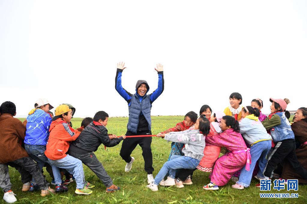 7月14日,河曲馬場(chǎng)小學(xué)老師道布旦(中)在草原上組織孩子們拔河。新華社記者 陳斌 攝