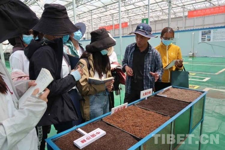 圖為綠亞生態(tài)的工作人員給同學們講解沙棘種子的選育