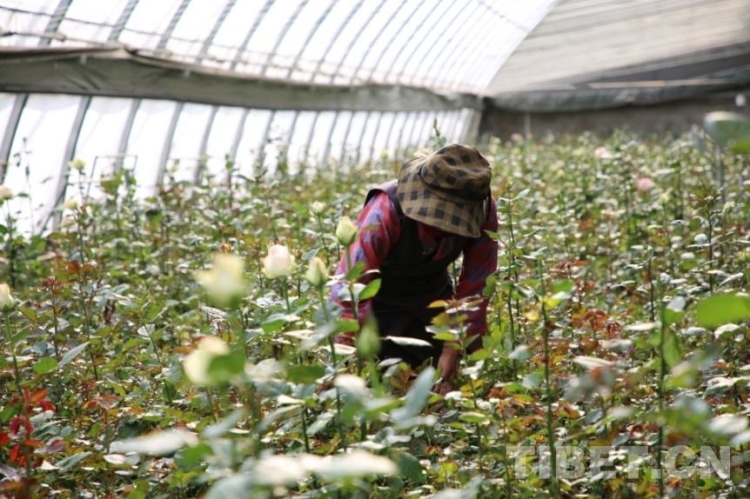 圖為工人正在玫瑰大棚內(nèi)對植株修整除草