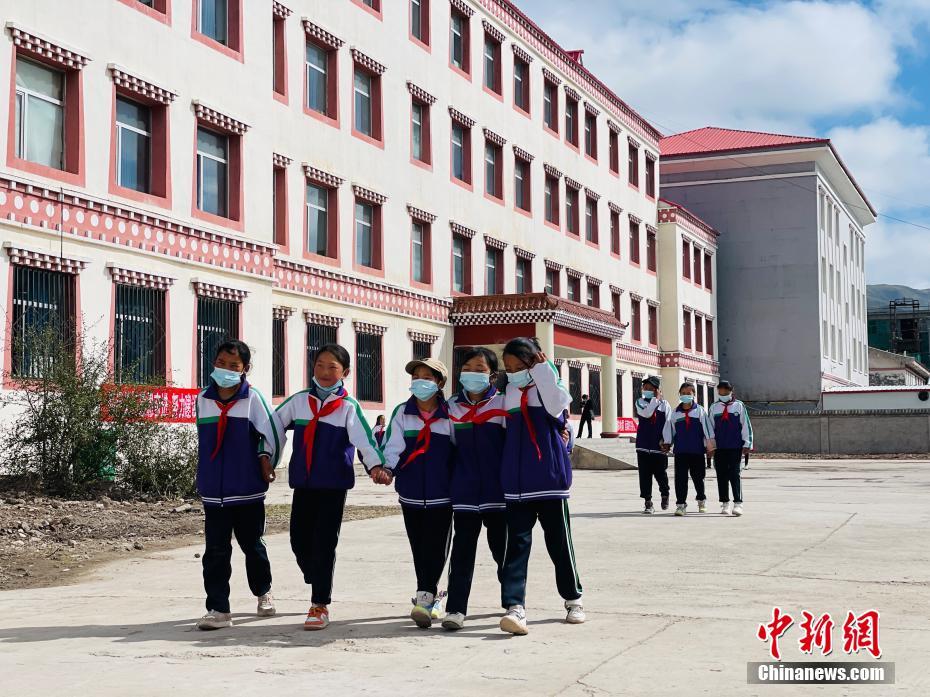 9月1日,青海省果洛藏族自治州瑪多縣地震災(zāi)后過渡安置一校區(qū)的同學(xué)們迎來了新學(xué)期。圖為學(xué)生們下課后走出教學(xué)樓。為確保青?,敹嗳h中小學(xué)(幼兒園)學(xué)生秋季正常開學(xué),該縣對(duì)災(zāi)區(qū)2933名學(xué)生、322名教職工分批次過渡安置到青海省果洛全州各校以及青海省三江源民族中學(xué)就學(xué)。 中新社記者 孫睿 攝