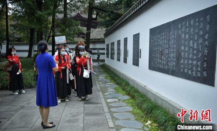在成都的港澳臺僑大學生們跟隨講解員參觀杜甫草堂博物館?!⒅铱?攝