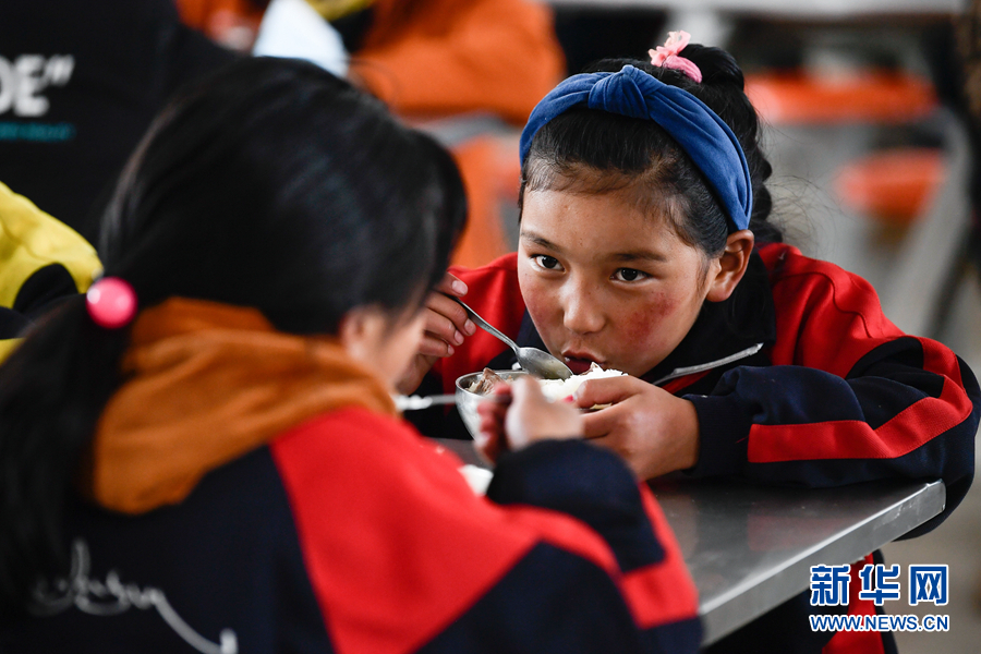 青海省果洛藏族自治州甘德縣崗龍鄉(xiāng)中心寄宿制小學(xué)的學(xué)生在食堂吃飯(3月17日攝)。新華社記者 張龍 攝