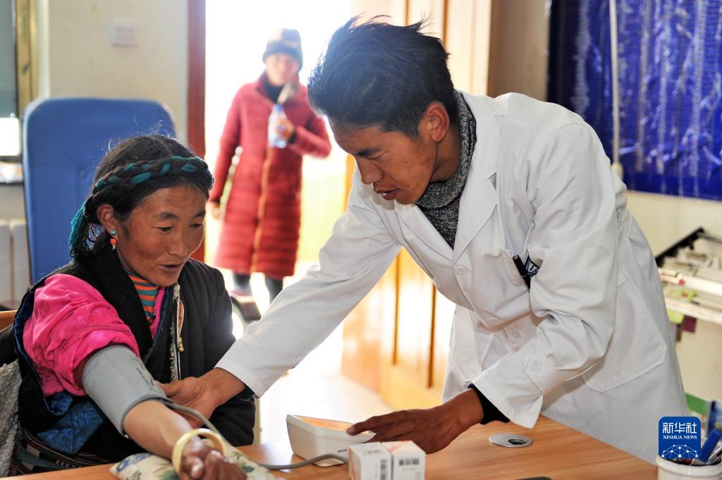圖為全科醫(yī)生旺扎在為一名農牧民測量血壓(2018年1月14日攝)。新華社記者張汝鋒 攝