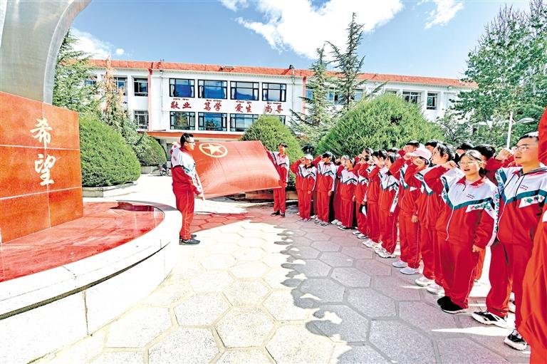 圖為拉薩中學(xué)的學(xué)生在團旗下重溫入團誓詞。