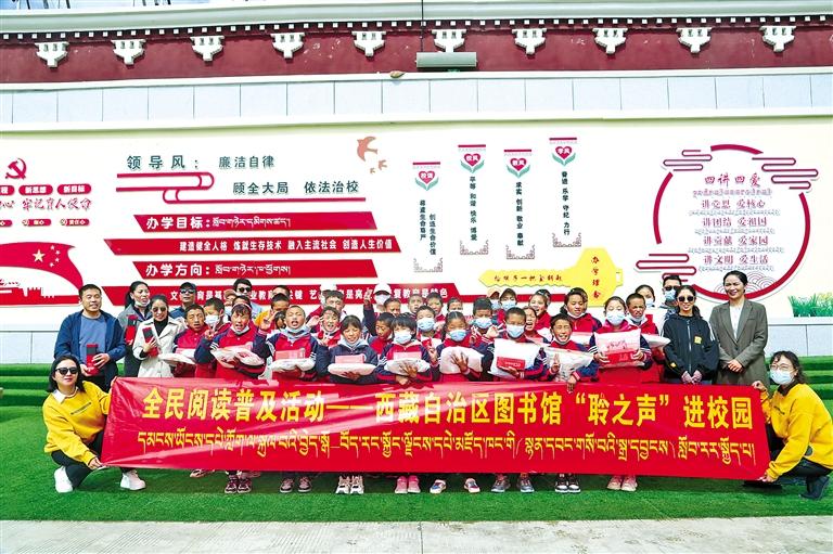 圖為工作人員向在場的學(xué)生發(fā)放了學(xué)習(xí)用品和全民閱讀普及月宣傳品50套。記者 格桑倫珠 攝
