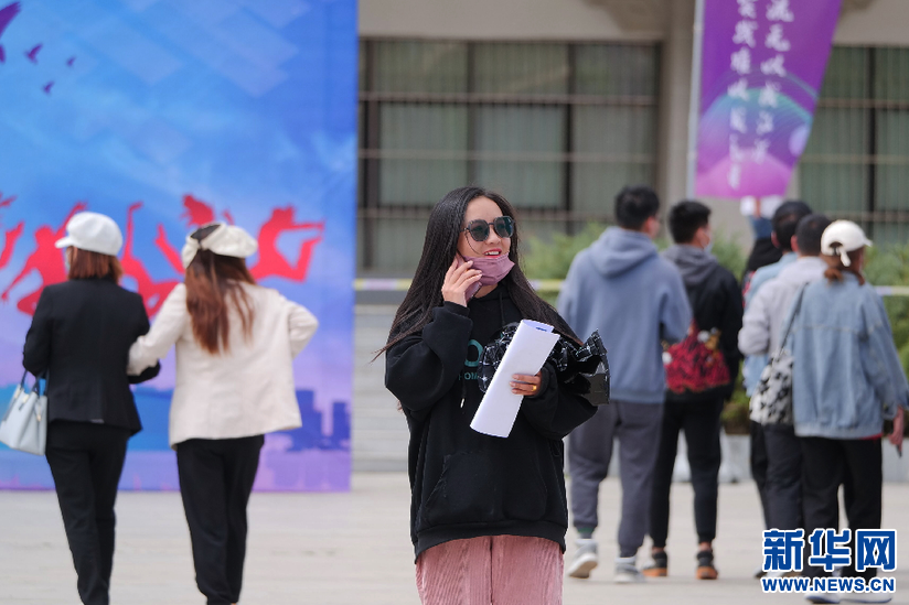 6月15日,應(yīng)屆畢業(yè)生在招聘會上打電話咨詢。新華網(wǎng) 旦增努布攝