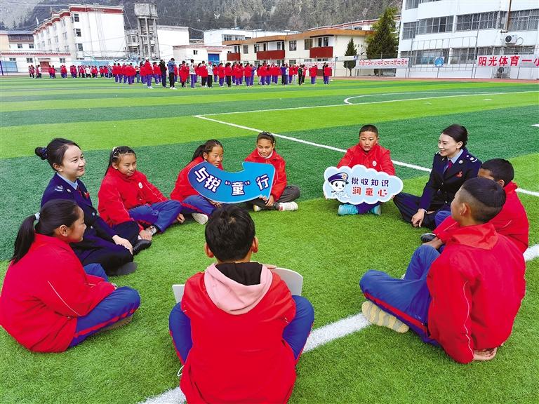 圖為林芝市稅務(wù)局青年黨員在波密縣完全小學開展稅法宣傳。記者 張猛 攝