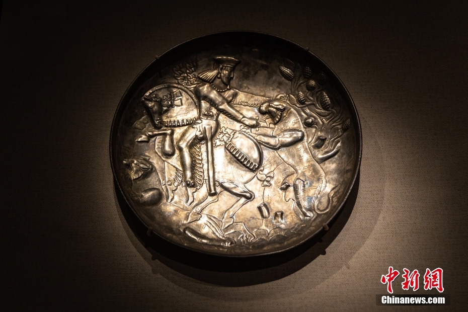 8月18日,甘肅省敦煌市,“燦爛記憶:從美索不達(dá)米亞到犍陀羅——東方文明古國(guó)冶金術(shù)展”在敦煌莫高窟揭幕。此次展覽是敦煌研究院與日本平山郁夫絲綢之路美術(shù)館近年第三次合作,展覽共展出從地中海沿岸,到中亞絲綢之路沿線國(guó)家的金屬類文物221組件、絲路錢幣33枚,時(shí)間跨度長(zhǎng)達(dá)4000多年、范圍遍及歐亞大陸的絲綢之路上各大文明區(qū)域冶金術(shù)的變化圖景。圖為參展展品帝王狩獵紋盤。 中新社發(fā) 王嘉奇 攝