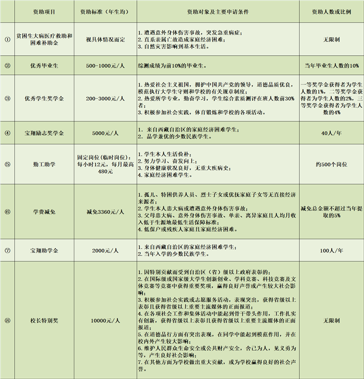這些資助項(xiàng)目包括國(guó)家政策、西藏自治區(qū)政策和西藏各高校的政策,全部列出了明確的申請(qǐng)條件,涵蓋了學(xué)生生活、學(xué)習(xí)的方方面面。其中,有的項(xiàng)目針對(duì)家庭經(jīng)濟(jì)困難的學(xué)生給予學(xué)費(fèi)、住宿費(fèi)等的減免;有的項(xiàng)目為學(xué)生提供各種校內(nèi)勤工助學(xué)機(jī)會(huì),讓學(xué)生通過勞動(dòng)獲得報(bào)酬;有的項(xiàng)目獎(jiǎng)勵(lì)入伍,有的項(xiàng)目獎(jiǎng)勵(lì)發(fā)明創(chuàng)造……并且,西藏各高校在制定資助政策時(shí)體現(xiàn)出了各學(xué)校鮮明的辦學(xué)特點(diǎn)。例如,西藏藏醫(yī)藥大學(xué)設(shè)置了面向所有學(xué)生的“記誦《三部醫(yī)典》獎(jiǎng)”,要求“熱愛社會(huì)主義祖國(guó),擁護(hù)中國(guó)共產(chǎn)黨的領(lǐng)導(dǎo);遵紀(jì)守法,遵守學(xué)校規(guī)章制度;背誦學(xué)生按‘三部醫(yī)典’章節(jié)順序依次背誦。在背誦過程中,要吐字清晰,聲音宏亮,總時(shí)間不能超過2個(gè)小時(shí)?!狈彩沁_(dá)到要求的學(xué)生,獎(jiǎng)勵(lì)1800元。