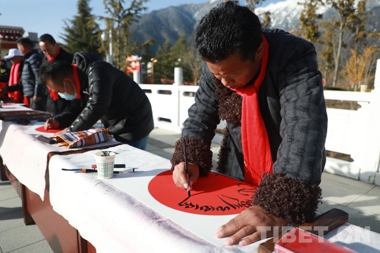在林芝市藏醫(yī)院工作的巴桑次仁,是林芝市文聯(lián)書法家協(xié)會(huì)會(huì)員。當(dāng)天一大早,林芝市文聯(lián)書法家協(xié)會(huì)的各位書法家揮毫潑墨,不停地為群眾寫下新年祈福和愿望?,F(xiàn)場(chǎng)群眾簇?fù)碛^摩,與書法家們認(rèn)真交流,臉上不時(shí)揚(yáng)起幸福的笑容。據(jù)悉,活動(dòng)當(dāng)天,書法家協(xié)會(huì)共送出100余副春聯(lián)、150余幅字畫。
