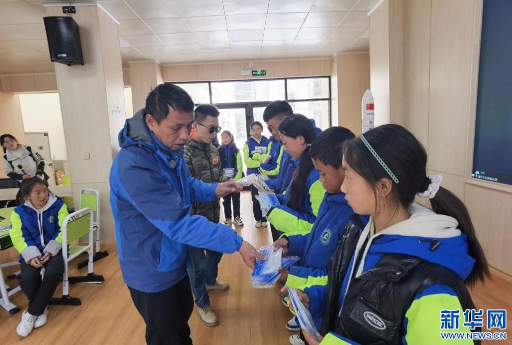 福建省第十批援藏工作隊(duì)教育組教師代表正在為學(xué)生們發(fā)放書(shū)籍和口罩。