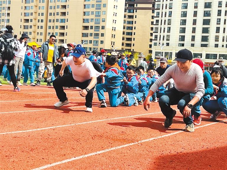 圖為學(xué)生及家長參加接力賽。記者 央金 攝