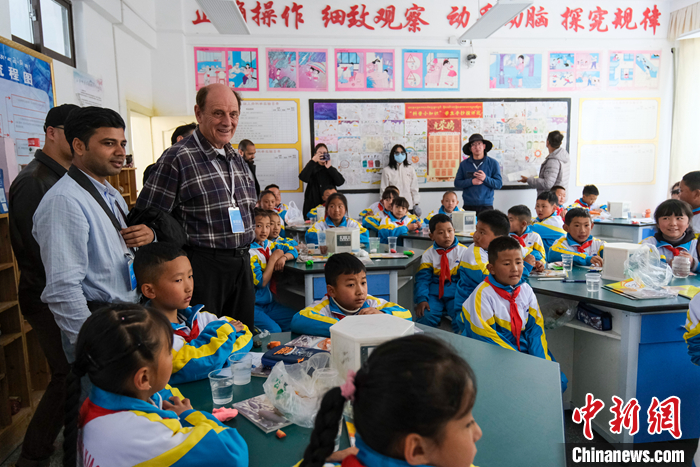 圖為5月18日上午,參訪團(tuán)成員在林芝市第二小學(xué)觀看孩子們上實驗課。 中新社記者 江飛波 攝