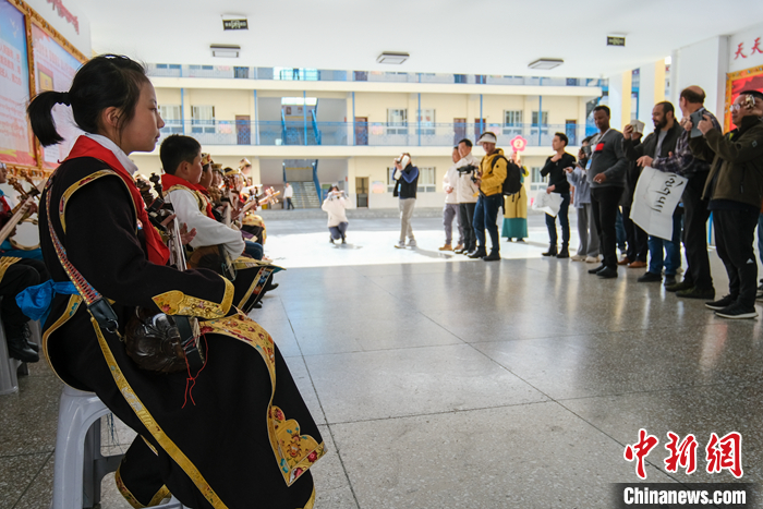 進(jìn)入校園后,歡快的扎念琴聲傳來,十多位孩子聚在一起彈奏著。一曲表演完畢,現(xiàn)場掌聲熱烈。