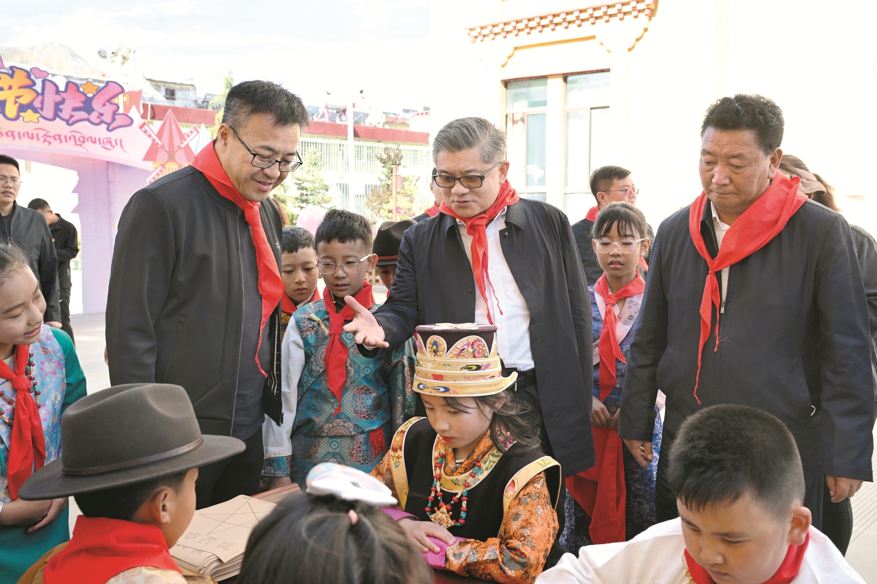 拉薩市第一小學(xué)是西藏和平解放后拉薩開(kāi)辦的第一所公立小學(xué),建校70年來(lái),為新西藏各項(xiàng)建設(shè)事業(yè)輸送了萬(wàn)千棟梁人才。來(lái)到拉薩市第一小學(xué)江蘇路分校,身著民族服飾的藏族小姑娘南杰拉措為王強(qiáng)一行系上鮮艷的紅領(lǐng)巾,并熱情帶領(lǐng)王強(qiáng)一行走向校園。