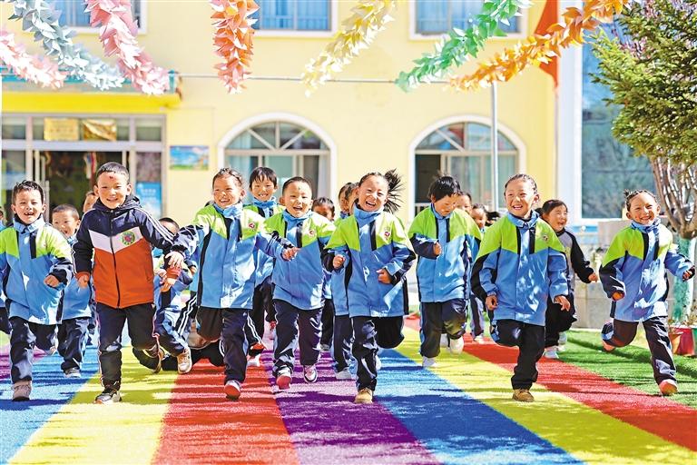山南市瓊結(jié)縣雙語幼兒園兒童在園內(nèi)嬉戲。
