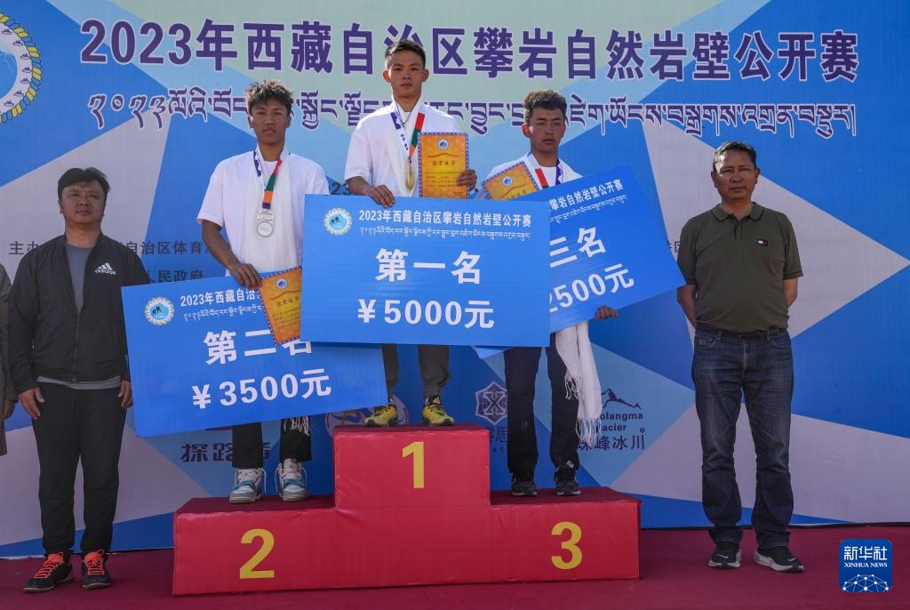 圖為2023年西藏自治區(qū)攀巖自然巖壁公開賽男子組冠軍羅金濤(中)、亞軍強巴平措(左二)和季軍赤列平措(右二)在頒獎儀式上合影(6月23日攝)。新華社記者 黃耀漫 攝