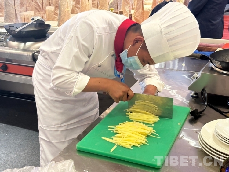 圖為來自阿里地區(qū)中等職業(yè)技術學校的參賽選手桑杰元旦在切土豆絲 攝影:旦曲
