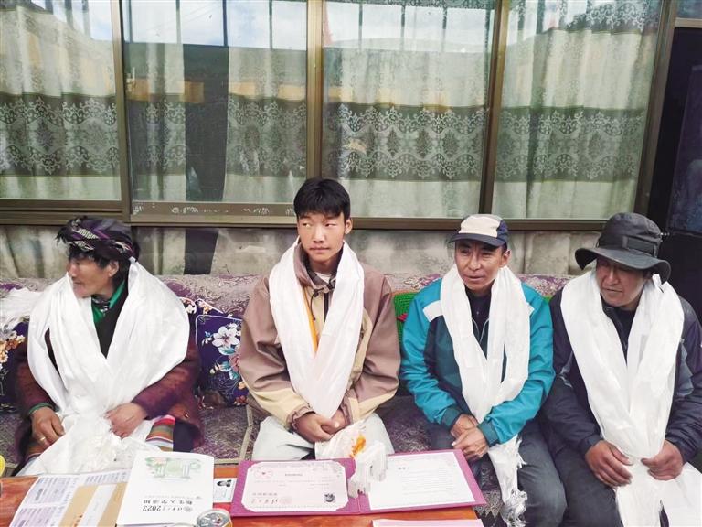 收到清華大學(xué)錄取通知書,大家給久米次仁及家人獻(xiàn)上哈達(dá)。圖由久米次仁提供