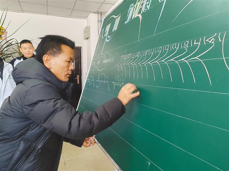 圖為洛桑多吉老師為學(xué)生們傳授藏文書(shū)法知識(shí)。