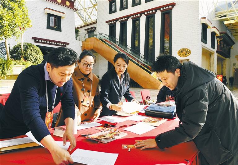 圖為參加西藏自治區(qū)兩會的政協(xié)委員在駐地領(lǐng)取證件和會議資料。記者 旦增蘭澤 攝