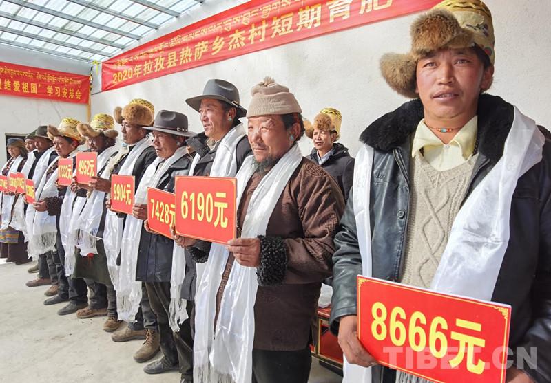 資料圖:圖為西藏日喀則市拉孜縣熱薩鄉(xiāng)杰村參與短期育肥農(nóng)民專業(yè)合作社的村民們領到了分紅款