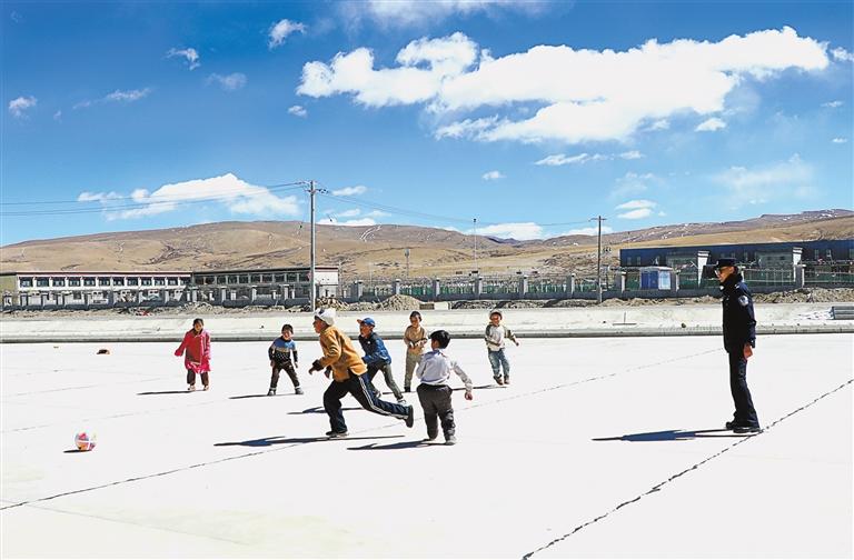 在結(jié)束執(zhí)勤,返回宿舍途中,里孜出入境邊防檢查站民警楊會(huì)強(qiáng)、盧帆忽聞一陣嬉笑。循聲看去,口岸邊貿(mào)市場(chǎng)停車場(chǎng)內(nèi),一群充滿活力的小朋友,正圍著一個(gè)破舊足球追趕。