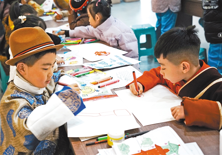 圖為孩子們?cè)谡桂^內(nèi)繪畫。記者 袁海霞 鄭璐 通訊員 普珍 攝