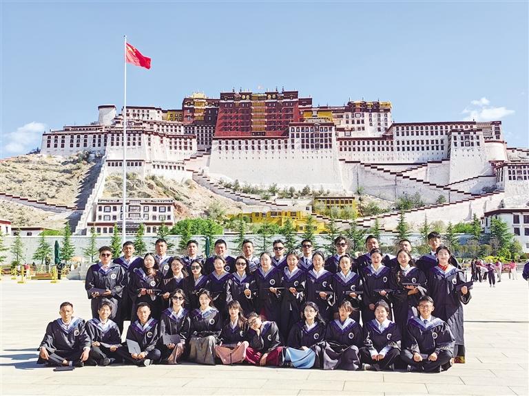 拍攝畢業(yè)照則是高校每一屆畢業(yè)生的“狂歡”。盛夏里,高校畢業(yè)生們身穿學(xué)士服或獨(dú)具特色的藏裝,相互獻(xiàn)哈達(dá),在布達(dá)拉宮廣場、在校園、在羅布林卡、在拉薩河邊留下青春最美的樣子,定格炙熱的青春歲月。