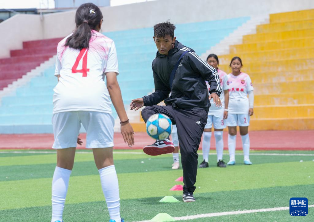 西藏日喀則市上海實驗學校“珠峰雪鷹”女子足球隊教練洛布桑在操場上指導球員訓練(9月3日攝)。新華社記者 丁汀 攝