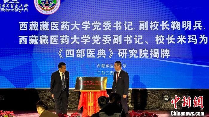 圖為西藏藏醫(yī)藥大學黨委書記、副校長鞠明兵(右)和西藏藏醫(yī)藥大學黨委副書記、校長米瑪(左)共同為《四部醫(yī)典》研究院揭牌。謝牧 攝