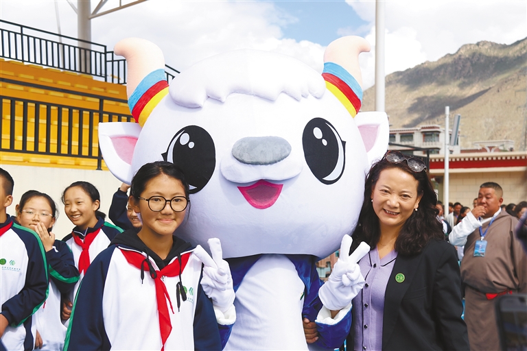 拉薩北京實(shí)驗(yàn)中學(xué)學(xué)生與學(xué)校吉祥物“小京羚”合影留念。