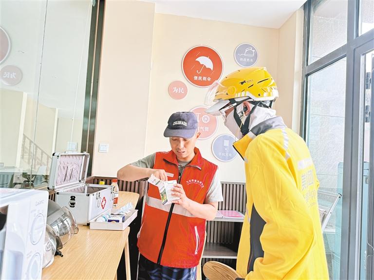 圖為社區(qū)工作人員在驛站為外賣員免費提供藥品。記者 武沛濤 攝
