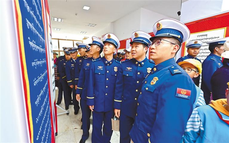 圖為西藏森林消防總隊(duì)消防員參觀書(shū)法展。記者 唐斌 王敏 攝