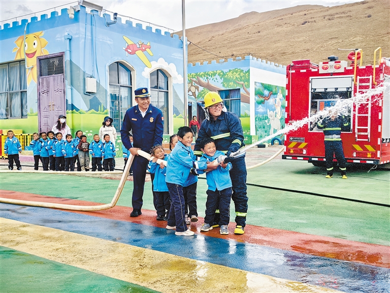 近日,西藏消防救援總隊(duì)的隊(duì)員駕駛著紅色消防車來(lái)到日喀則市定日縣扎西宗鄉(xiāng)班定村幼兒園,為師生們帶來(lái)了一堂別開(kāi)生面的消防安全體驗(yàn)課。