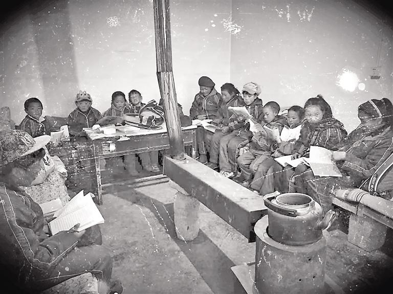 上世紀80年代,那曲縣(色尼區(qū))完全小學(xué)學(xué)生圍坐在火爐旁上課。