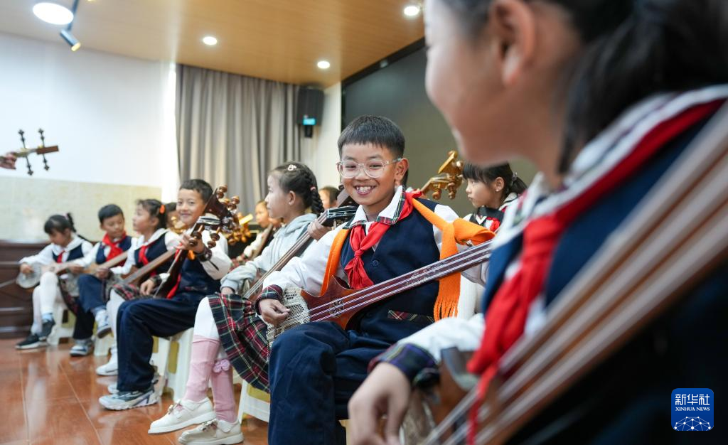 9月11日,在拉薩市實驗小學,孩子們在彈奏扎念琴。新華社記者 晉美多吉 攝