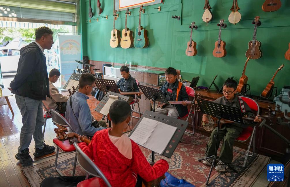 9月13日,在拉薩市古樂扎念琴行,孩子們在彈奏扎念琴。新華社記者 晉美多吉 攝