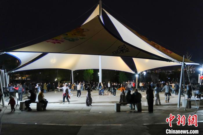 4月26日晚,在拉薩柳梧中心公園跳鍋莊舞的市民,現(xiàn)場(chǎng)熱鬧非常。 中新社記者 江飛波 攝