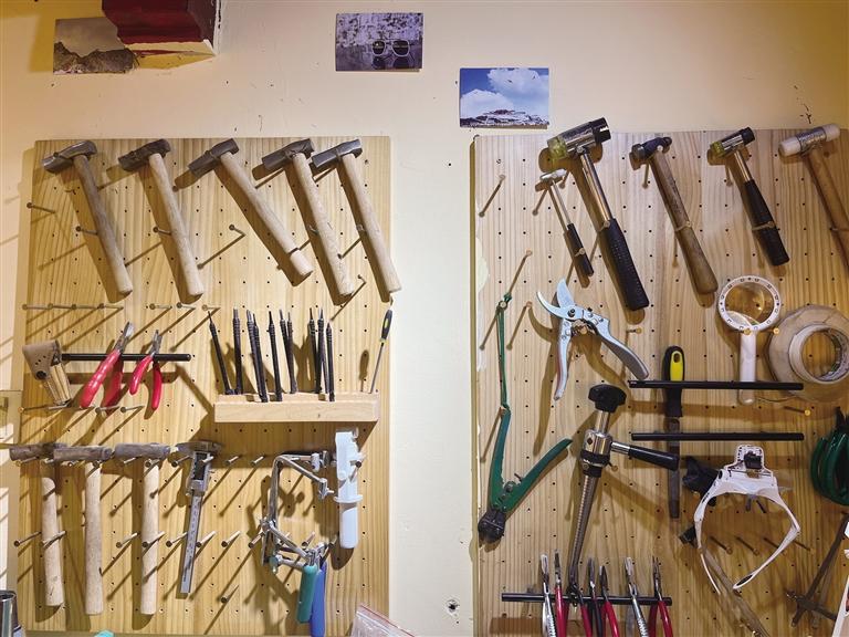 步入堯西平康古建大院,陽光灑落,透過蘋果樹與核桃樹的葉縫,投下片片陰涼,在樹下落座,幽思與怡然不禁飄然而至。耳邊偶爾會傳來陣陣“叮叮當當”清脆悅耳的敲打聲。聲音源自物喜手工工作室,工作室主理人是42歲的霍志勇,一位將激情與心血全部傾注在打銀工藝中的匠人。霍志勇旅居西藏12年,自2018年在云南學習了銀飾制作技藝后,便回到拉薩致力于探索當代元素與傳統(tǒng)藏式風格結合的手工銀飾制作。