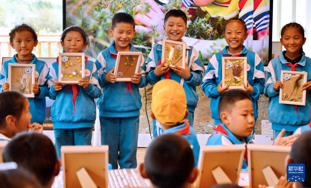 8月15日,拉魯小學(xué)的學(xué)生在拉魯濕地國家級自然保護(hù)區(qū)管理局科普小教室里向大家展示優(yōu)秀植物標(biāo)本。新華社記者 張汝鋒 攝