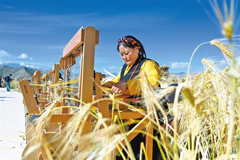 萬里晴空下,金色青稞隨風(fēng)搖曳,靜等豐收的季節(jié);希望的田地上,在傳承和創(chuàng)新中,千年氆氌再現(xiàn)輝煌。