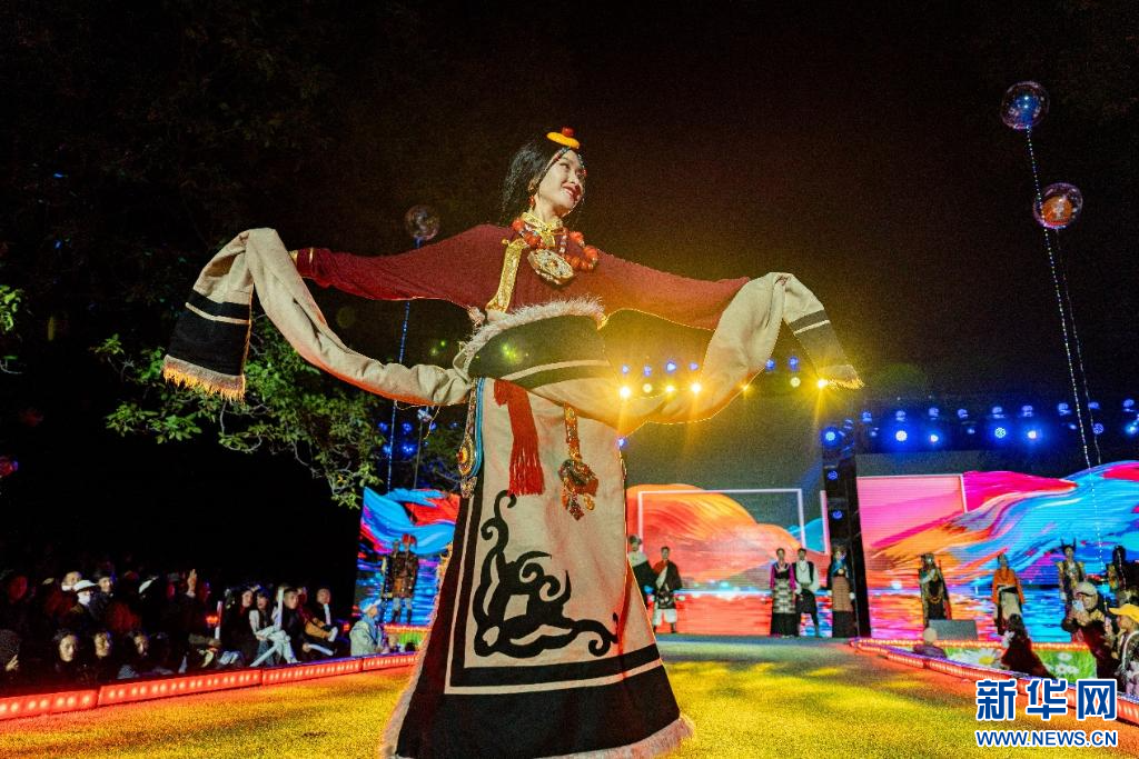 24日,西藏山南市加查縣舉辦“魅力達(dá)布·印象綻放”民族服飾秀活動。色彩斑斕的民族服飾在現(xiàn)場雨珠與燈光的點綴下,更顯生動與靚麗。