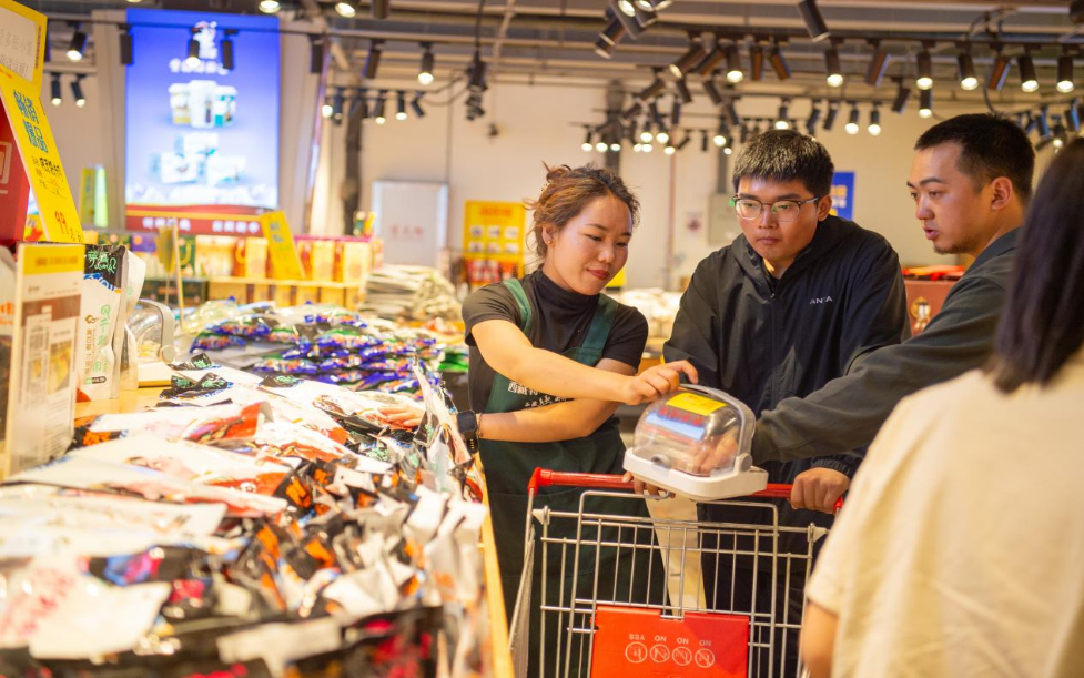 游客在西藏特產(chǎn)倉儲超市乃倉店試吃牛肉干。