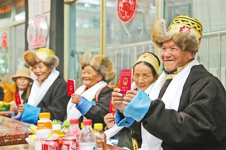 圖為山南市瓊結(jié)縣特困人員集中供養(yǎng)服務(wù)中心的“新人”阿南高興地展示自己的結(jié)婚證。 記者 白瑪澤旺 通訊員 倫珠澤旺 攝