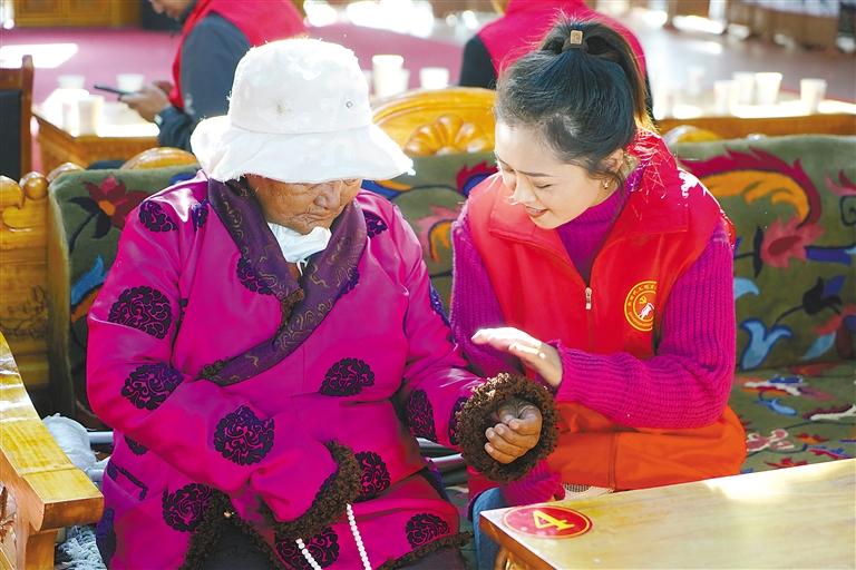 圖為那曲市索縣新時代文明實踐中心為特困人員集中供養(yǎng)服務(wù)中心的老人送去關(guān)心和關(guān)愛。 記者 曲珍 通訊員 王霖 攝