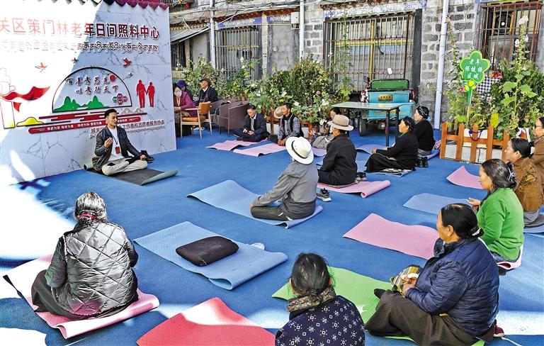 圖為拉薩市城關(guān)區(qū)策門林老年日間照料中心舉辦培訓(xùn),教老人們練習(xí)瑜伽。 記者 旦增蘭澤 攝